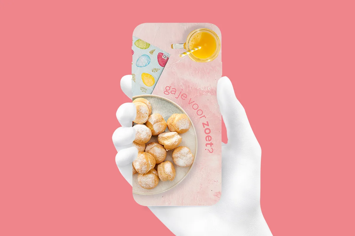 Afbeelding case SPAR roze achtergrond, witte hand houdt afbeelding vast in de vorm van een telefoon