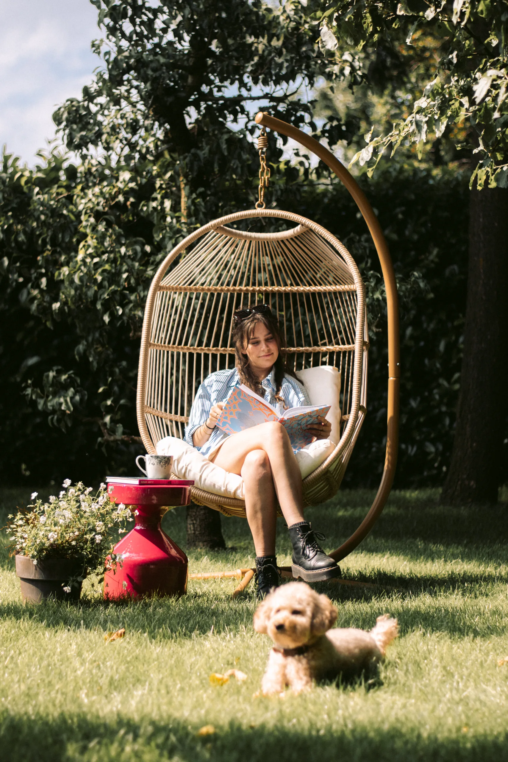Vrouw lezend in een ei stoel met een hond in de voorgrond